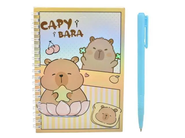 Libreta rayada con lapicera retráctil.Medidas: 17x12cm.38 hojas rayadas.Lapicera retráctil de tinta azul. Diseño: carpibara. En bolsa.